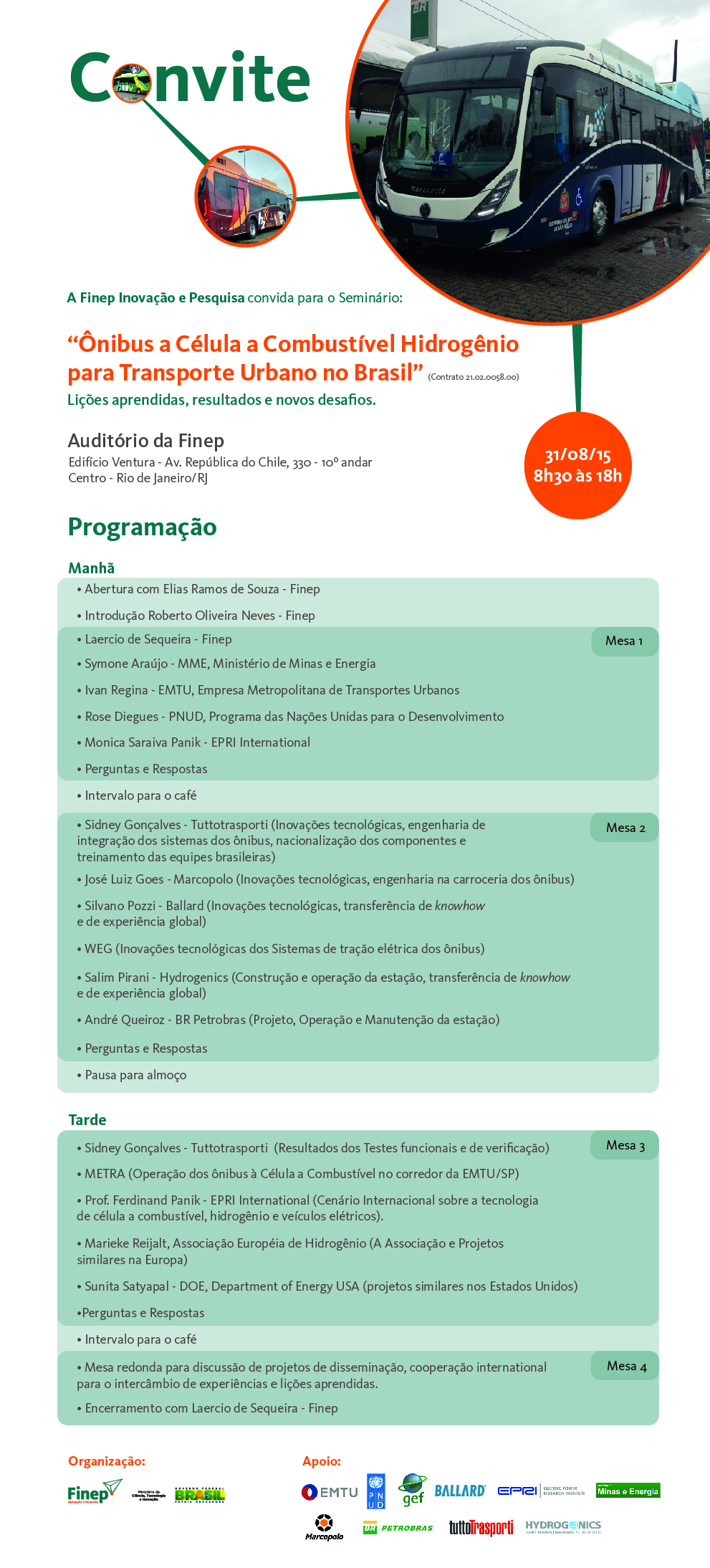 Na próxima segunda-feira, 31/08, a financiadora organizará o seminário Ônibus a Célula a Combustível Hidrogênio para Transporte Urbano no Brasil, no qual serão expostos os principais desafios enfrentados durante a realização do projeto, os resultados obtidos e as perspectivas futuras sobre esta nova tecnologia. O evento contará com a participação do Diretor de Inovação da Finep, Elias Ramos, e de representantes de órgãos e empresas envolvidos na iniciativa.