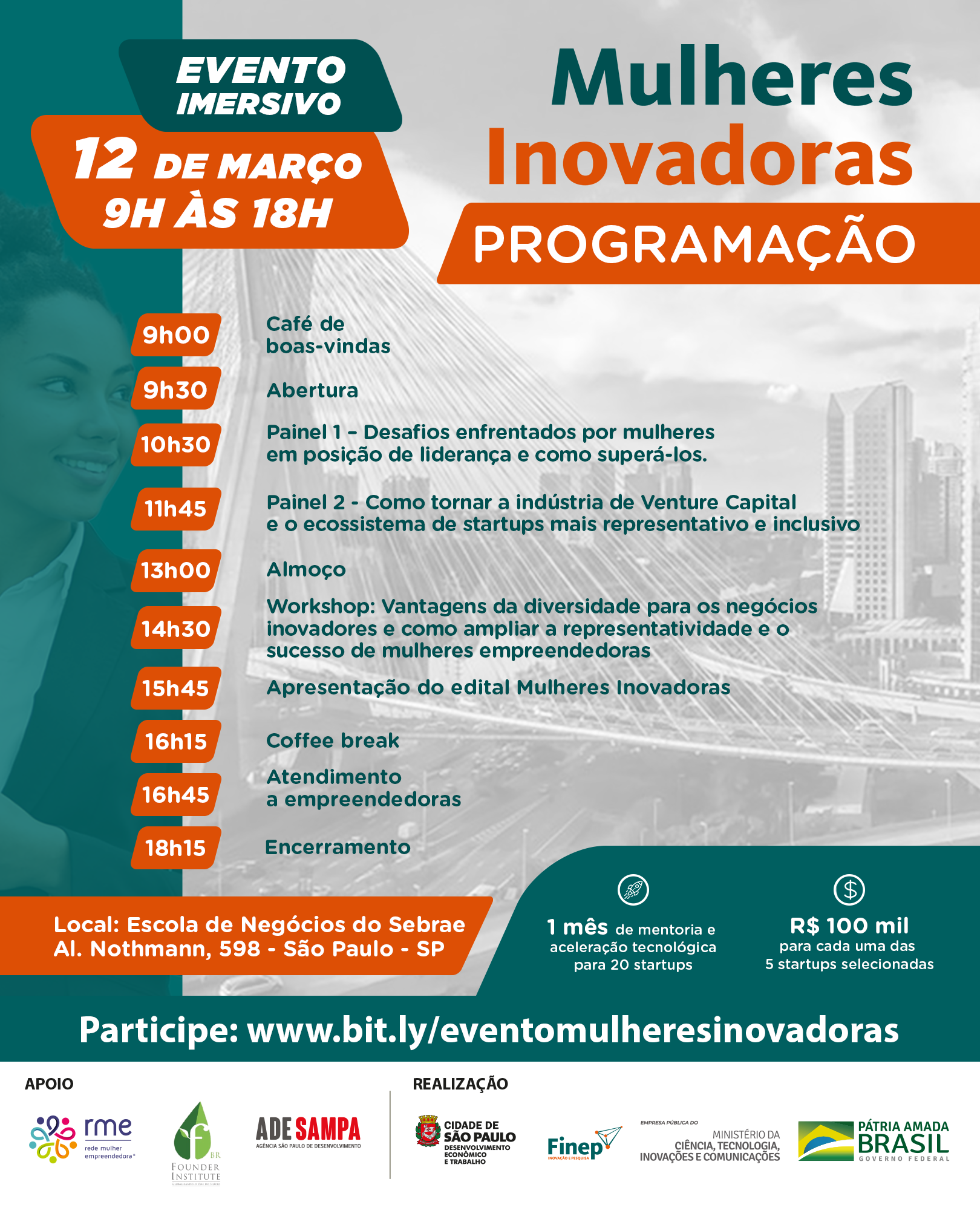 O Programa Mulheres Inovadoras conta, ainda, com o apoio da Adesampa, da RME - Rede Mulher Empreendedora e do Founder Institute.