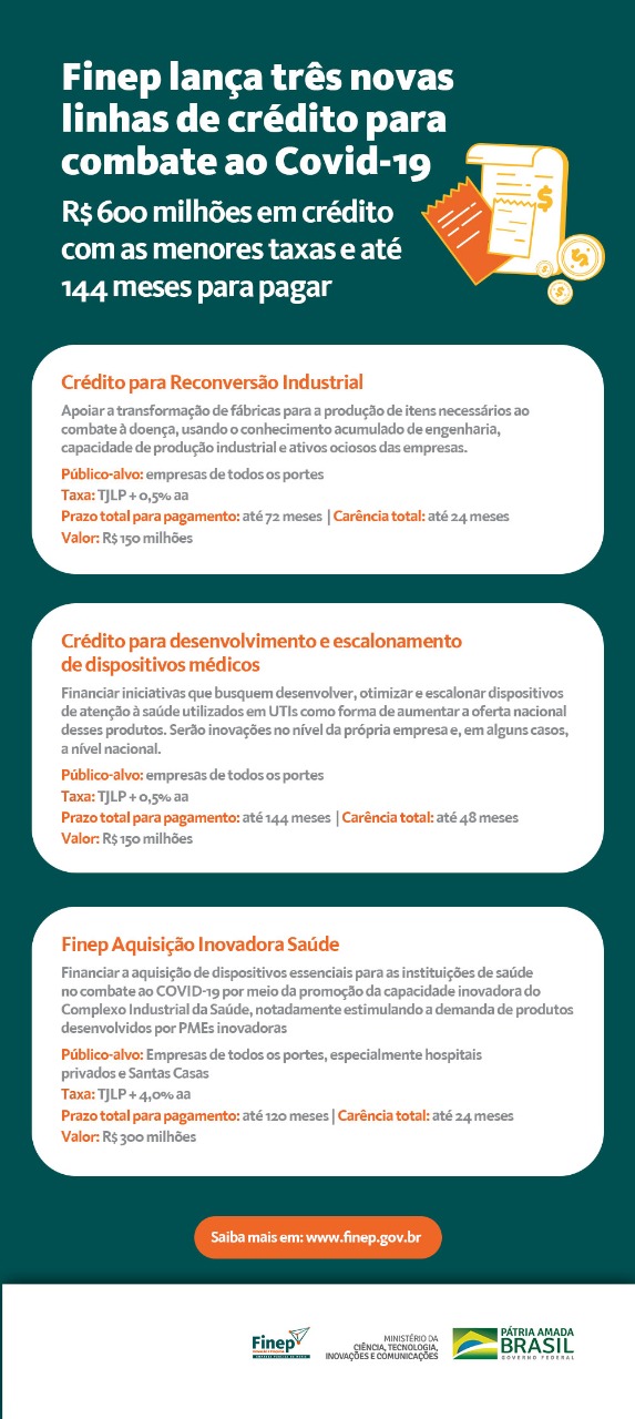 A Finep, empresa pública do Ministério da Ciência, Tecnologia, Inovações e Comunicações (MCTIC), acaba de aprovar linhas de crédito, no valor total de R$ 600 milhões, para enfrentamento da COVID-19.