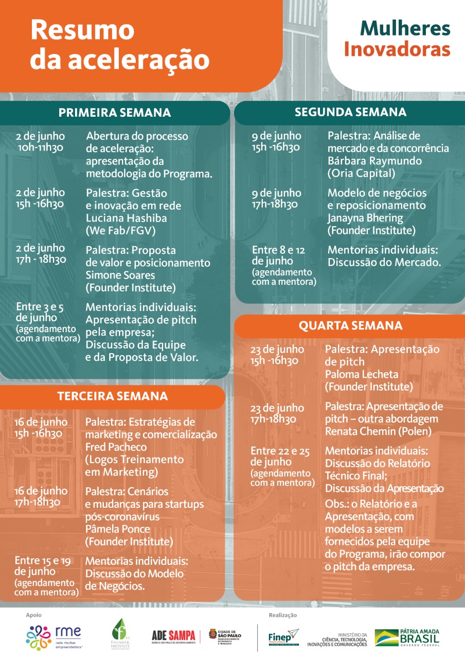 O programa é uma atividade decorrente do Acordo de Cooperação Técnica firmado entre o Ministério da Ciência, Tecnologia, Inovações e Telecomunicações (MCTIC), a Finep e a prefeitura do município de São Paulo, que tem como finalidade apoiar o empreendedorismo feminino, procurando utilizar a experiência das instituições na formulação de políticas, coordenação de programas e aporte de recursos para o apoio a empresas nascentes inovadoras e de base tecnológica.