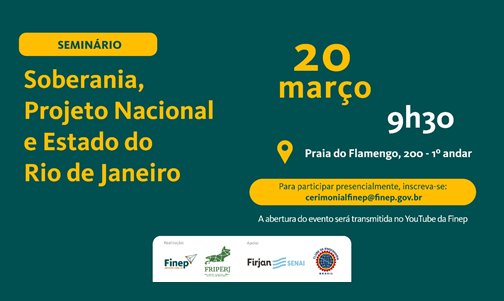 Em parceria com o Fórum de Reitores das Instituições Públicas de Ensino do Estado do Rio de Janeiro (FRIPERJ), a Finep recebe, em sua sede no Rio, o I Seminário FRIPERJ-FINEP: Soberania, Projeto Nacional e Estado do Rio de Janeiro. Nos dias 20 de março, 7 e 14 de abril, o ecossistema de Ciência, Tecnologia e Inovação no estado será pauta a partir de debates sobre o desenvolvimento fluminense, no cenário nacional, particularmente em um ano de eleições.